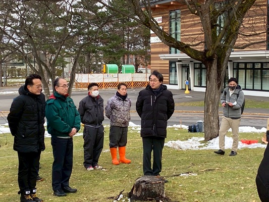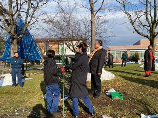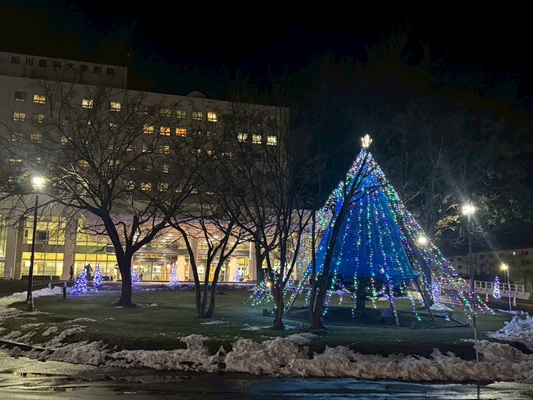 完成したツリーのライトアップを終えて、旭川医大の西川学長から「毎年学生や職員だけでなく、患者の何よりの癒しになっている」と感謝の言葉をいただきました。
