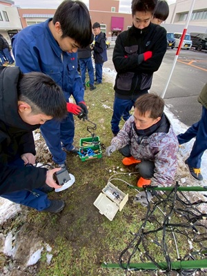 令和7年11月20日(木)、旭川工業高校の電気科2年生を対象に出前授業を行いました。組合青年部が2021年度から取り組んでいる出前授業で、今年で5年目になります。28人の生徒が参加し、青年部員と旭川医大病院のロータリー内にイルミネーションのミニツリーを設置しました。